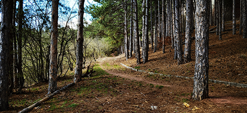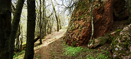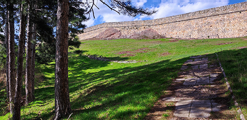 Пътеката се вие покрай сурови скалисти масиви и ни отвежда до борова гора, очертана с ниски бордюри – знак, че вече сме близо до Белоградчишката крепост. Районът около нея е бил облагороден преди години, а тясната пътека преминава в по-широка алея, която плавно се изкачва през гората.